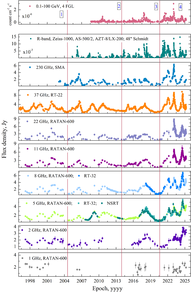 One important feature of some blazars is the presence of recurring changes in brightness. The quasi-periodic variability occurs at the timescales ranging from months to many years. Possible causes for this regularity include the presence of a supermassive binary black hole (SMBBH) system (Fig. 1) orbiting each other, a slow change in the direction of the relativistic jet, or a complex internal structure of the jet near its base. Understanding the nature of these processes requires comparing observational data in different spectral ranges — from radio waves to γ-rays.