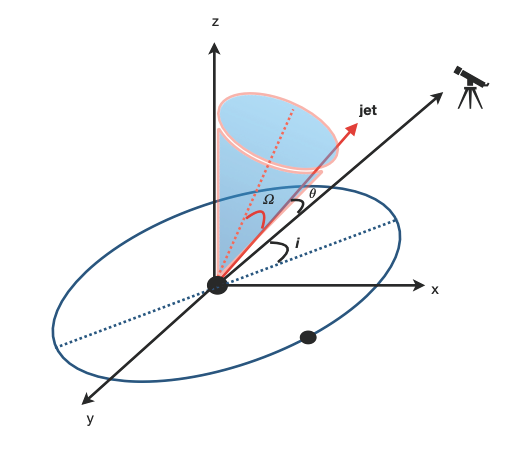 A schematic illustration of jet orbital motion and precession. The elements are not to scale. The binary SMBH is shown as two black dots, the jet is the red arrow, the angle between it and the observer’s line of sight is θ, the orbit inclination angle with respect to the observer is i, and the precessing cone angle is Ω.