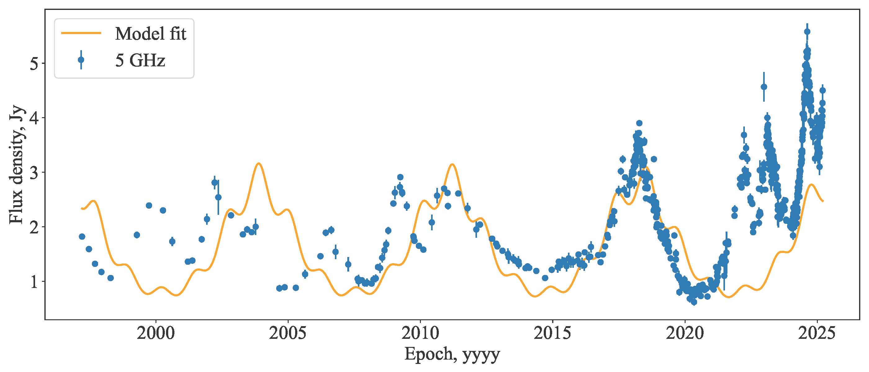 The jet orbital motion and precession model (orange) applied to the 5 GHz light curve of Ton 599.