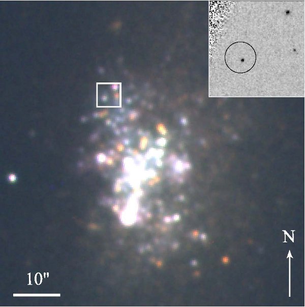 Рис.1. Цветное изображение галактики UGC 6456, составленное по данным БТА/SCORPIO в фильтрах B,V и Rc. На врезке крупно показана отмеченная квадратом область вокруг UGC6456 ULX, изображение которой получено с помощью космического телескопа им. Хаббла (камера WFPC2, фильтр F555W); кружок радиусом 0.8" соответствует неопределенности положения ULX для 90% доверительного интервала, полученного по данным Chandra. |